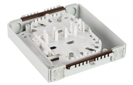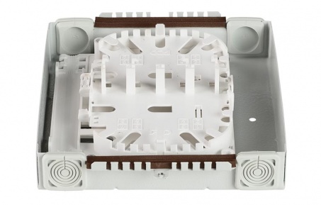 Внутри корпуса находится пластиковая вставка, на которой выкладывается запас волокна пигтейлов, размещаются ложементы для Гильз и оптических адаптеров(SC бесфланцевый)