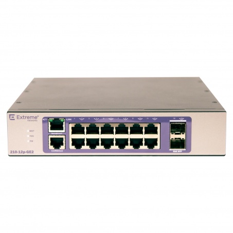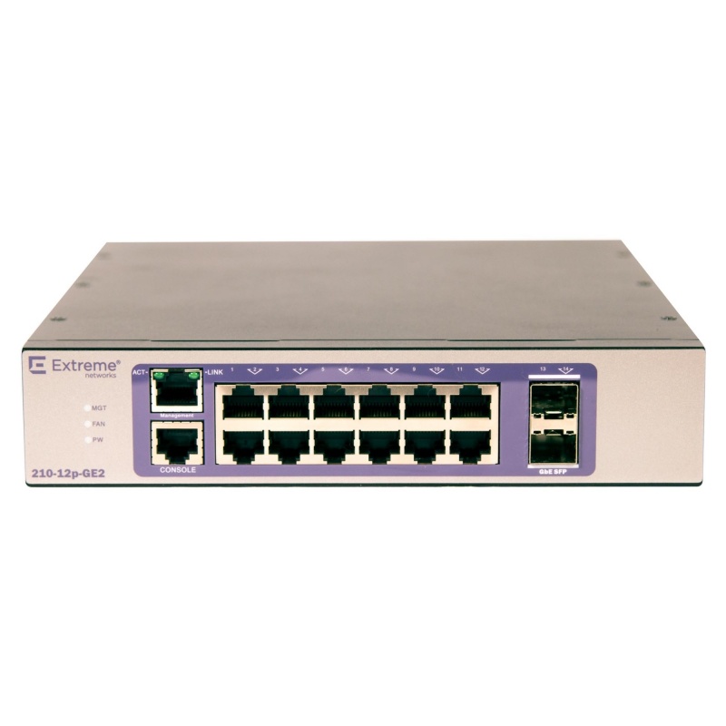 Коммутатор EXTREME 210-12P-GE2 - это коммутатор семейства управляемых коммутаторов Gigabit Ethernet Layer 2 с фиксированной конфигурацией, предназначенных для предприятий малого и среднего бизнеса и офиса, которые ищут ключевые функции в гибком, но простом в управлении решении. В данном коммутаторе доступны в 12 х 10/100/1000BaseT (RJ-45) портов, а также 2 встроенных порта SFP для uplink.