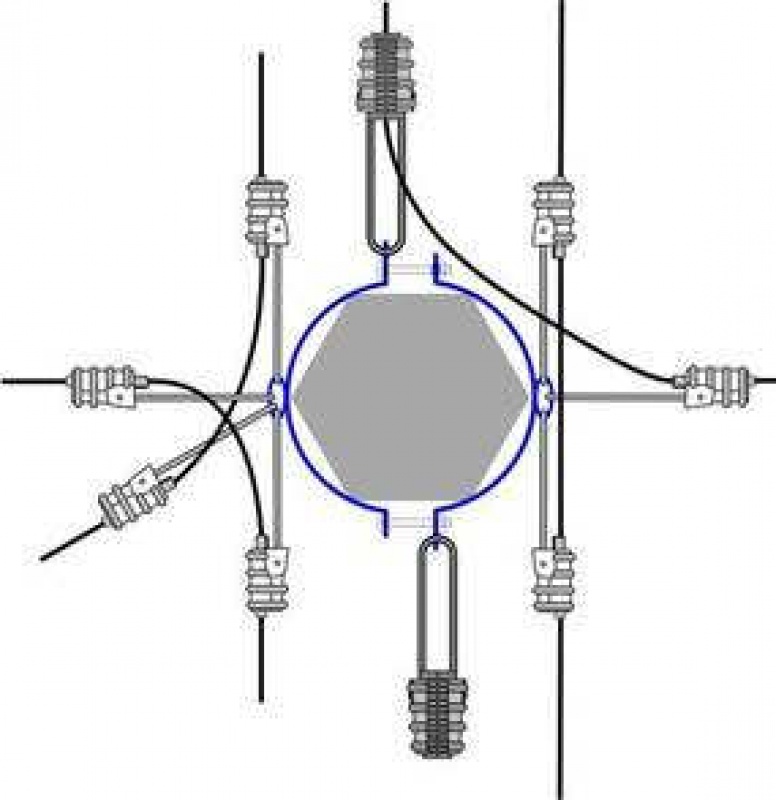 Данная траверса с легкостью обеспечивает функционал привычной траверсы, состоящей из уголка и скобы, позволяет выполнять монтаж 3-х параллельных линий и нескольких поворотов или отводов линии. Не смотря на ориентированность данной конструкции на применение с круглыми опорами, траверса обеспечивает достаточно прочное крепление и на квадратных опорах.