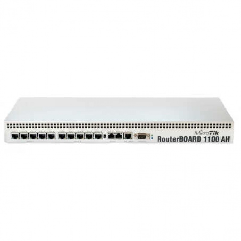 Mikrotik RouterBoard 1100AH - линейный центральный маршрутизатор (роутер-router), поддерживающий ускорение аппаратного шифрования, встроенного в ЦПУ. У него есть тринадцать отдельных гигабитных Ethernet-портов, две 5-ти портовых коммутаторных группы, а также возможность обходного (байпас) Ethernet. Также есть слот SODIMM, с подключенной оперативной памятью (RAM) на 2Гбайт, один слот для microSD карты, устройство звуковой сигнализации и последовательный порт.