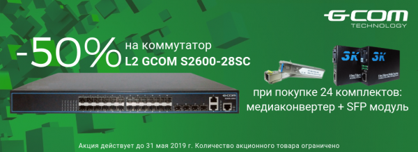 С 19.04.2019 по 31.05.2019 при покупке 24 комплектов для организации участка последней мили: медиаконвертер + модуль оптический Вы получаете скидку 50% на коммутатор управляемый L2 GCOM S2600-28SC c 24 портами 100 Base-X SFP.