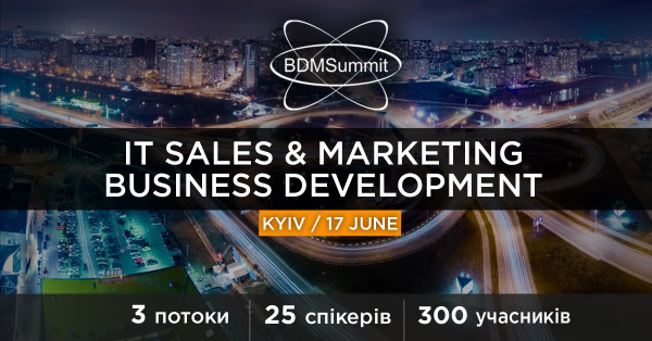 17 июня в Киеве будет проходить конференция BDMSummit 2017 Summer для sales-менеджеров, business development менеджеров, владельцев IT-аутсорсинговых компаний, а также для всех, кто желает быть в курсе IT-тенденций! В мероприятии будут принимать участие около 300 участников и 25 спикеров, которые значительно преуспели в продажах и развитии своих IT компаний. Детали и отзывы на официальном сайте BDMSummit.