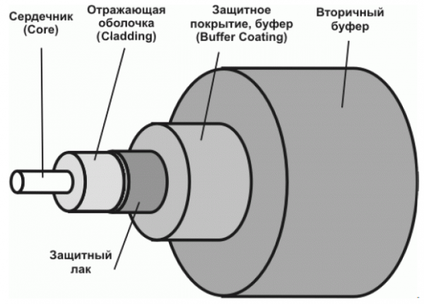 Остальные элементы кабеля только лишь способ предохранить хрупкое волокно от повреждений внешней средой различной агрессивности. Внешний диаметр отражающей оболочки унифицирован для всех типов кабелей и составляет 125±2 мкм. В этот размер также входит и слой лака, который служит защитой от влаги и связанной с ней коррозии.