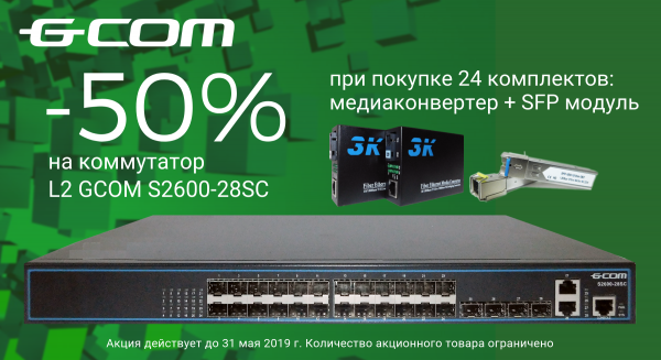 и получите 50% скидки на управляемый коммутатор L2 GCOM S2600-28SC c 24 портами 100 Base-X SFP.