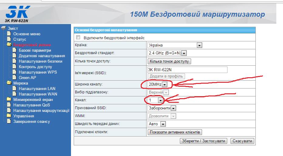 Рис.2 Настройки ширины канала 20 МГц для 3K RW622N и 1-го частотного канала.