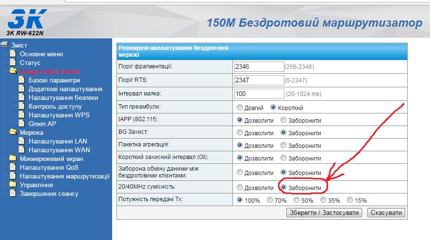 3. 20/40МГц совместимость должна быть запрещена. Это особенность настроек 3K RW622N. Если разрешить эту совместимость(она по умолчанию разрешена), то, даже выставив ширину канала 20МГц как показано на скриншоте выше, вы не добьётесь, чтобы роутер работал только с шириной канала 20 МГц – он всё ещё будет в автоматическом режиме самостоятельно выбирать ширину канала 20 МГц или 40 МГц, что в зашумлённой обстановке приведёт к снижению скорости передачи информации. На рис.3 приведён образец настройки запрета на совместимость каналов с шириной 20/40 МГц.