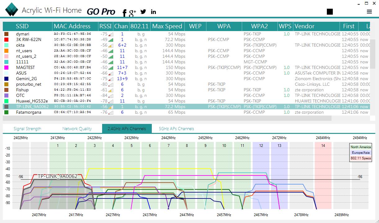Рис.4 Частотное распределение сетей Wi-Fi в стандартном многоэтажном здании – выделен уровень приёма от роутера TL WR740N.