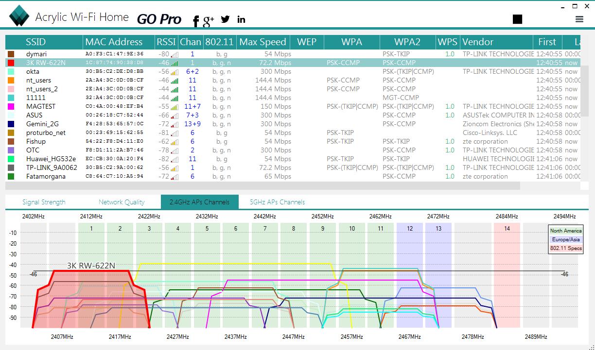 Рис.1 Частотное распределение сетей Wi-Fi в стандартном многоэтажном здании – выделен уровень приёма от роутера 3K RW622N.