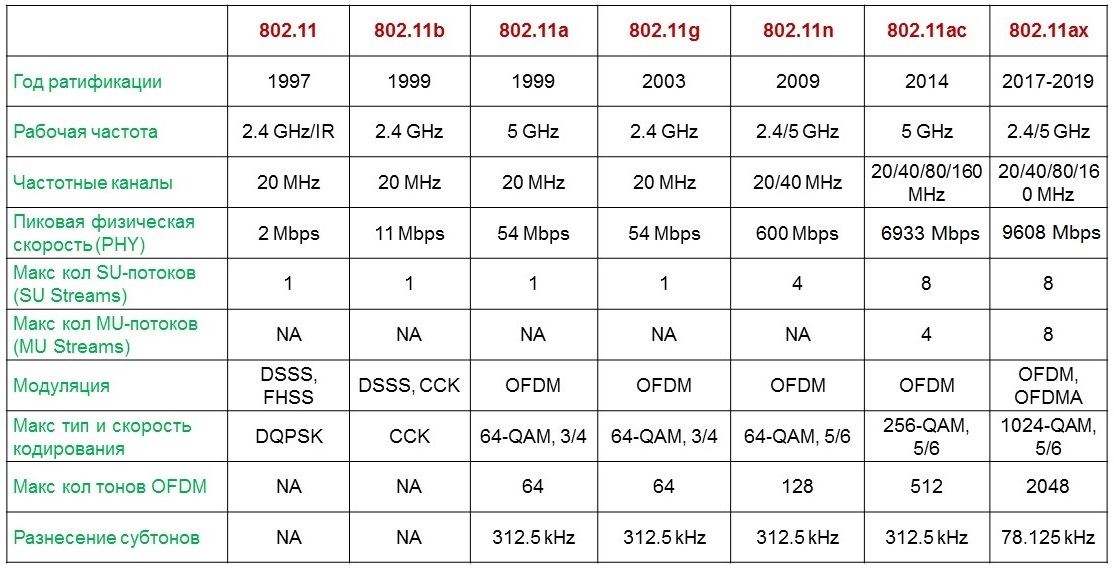 Ниже расположена таблица, по которой в целом можно понять, в чём заключаются базовые различия всех основных стандартов, которые принадлежат к группе Wi-Fi.