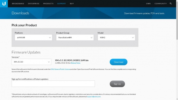 Для того, чтобы получить обновлённую версию Ubiquiti для нужного Вам устройства, следует перейти на официальный сайт разработчика по адресной ссылке - www.ubnt.com/download. Далее Вы увидите, что откроется новое окно, в нем нужно нажать - «Platform» и выбрать из перечня нужный вариант, такие же манипуляции применяем повторно во время осуществления выбора серии оборудования Product Group и модели: