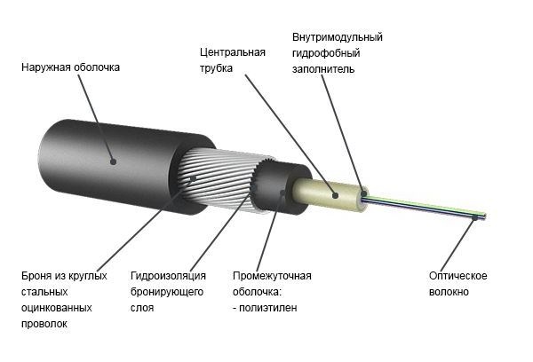 Оптический кабель состоит из некоторого количества оптических волокон, окружённых общей защитной оболочкой и состоит из: