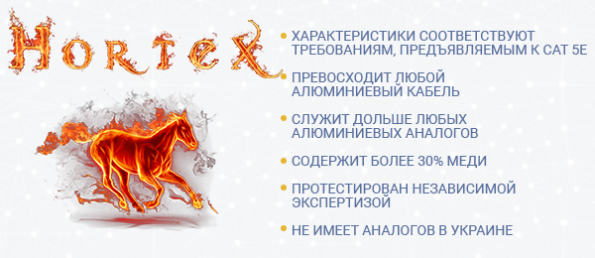 Кабель Hortex ® удовлетворяет все потребности, предъявляемые провайдерами. По своим характеристикам, кабель Hortex сравним с цельномедными вариантами витой пары. В сравнении с медными кабелями имеют на 31% меньшую стоимость. Качество используемых материалов гарантирует долговечность эксплуатации и устойчивость к окружающей среде.